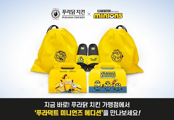 [세계비즈=황지혜 기자] 푸라닭 치킨은 유니버설 스튜디오 캐릭터 미니언즈와 콜라보레이션으로 제작한 한정판 시즌 패키지와 슬리퍼 굿즈 '푸라덕트(PURA-DUCT) 미니언즈 에디션'을 정식 출시했다고 5일 밝혔다.