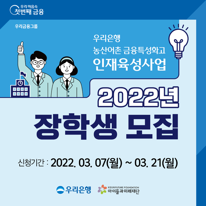 이번 사업은 상대적으로 취업 및 진로 교육의 기회가 적은 농산어촌 소재 금융특성화고 학생들의 경쟁력 강화를 돕기 위함이다. 우리은행은 사회복지법인 ‘아이들과미래재단’과 함께 선발 학생들의 금융권 취업과 진학 역량 강화를 위한 금융 자격증 취득 비용을 지원한다.