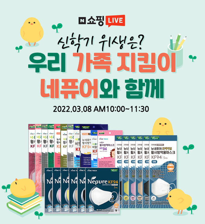 특집 방송은 이날 오전 10시부터 1시간 30분 동안 진행된다. 네퓨어 KF 보건용 마스크를 최대 65%의 할인된 가격에 만날 수 있다. 또한, 방송 중 마스크를 구매하는 고객들에겐 5매 추가 증정 혜택과 더불어 ‘스토어 찜’, ‘소식 알림’ 설정 시 중복 할인도 제공한다.