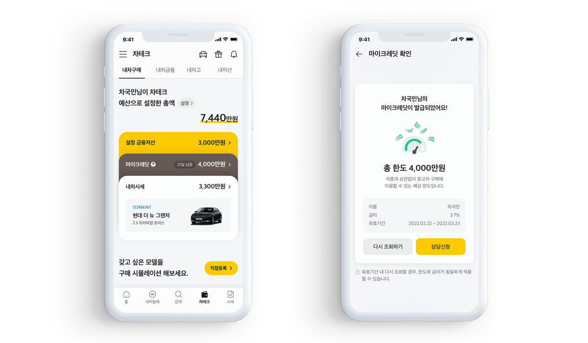 대표적인 서비스인 ‘내 차 구매’는 원하는 차종을 입력하고 마이데이터를 통해 조회된 금융자산 중 차량 구매에 사용할 예산을 설정하면 예산에 맞는 최적의 KB차차차 매물 차량을 추천받을 수 있다. 또 ‘내차고’ 서비스에 보유 차량을 등록하면 해당 차량의 시세를 예산에 포함해 이전 차량의 판매수익을 고려한 실질적인 차량 구매 계획을 수립할 수 있다. 예산이 부족한 경우에는 ‘마이크레딧’ 조회를 통해 자동차 구매에 필요한 대출 금액의 조회가 가능하다.