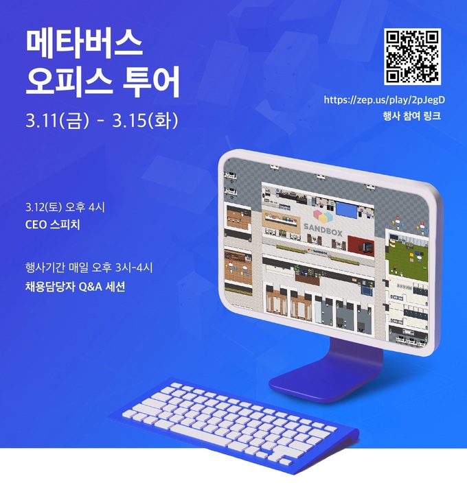 샌드박스는 11일부터 15일까지 메타버스 오피스 투어도 개최한다. 실제 샌드박스 오피스를 그대로 구현한 메타버스 플랫폼 젭(ZEP) 내에서 채용담당자 Q&A 세션이 투어 기간 내 매일 오후 3시부터 4시까지 진행된다. 오는 12일 토요일에는 이필성 대표의 지원자 대상 회사 소개가 오후 4시부터 채용 Q&A 세션에 이어서 진행될 예정이다.