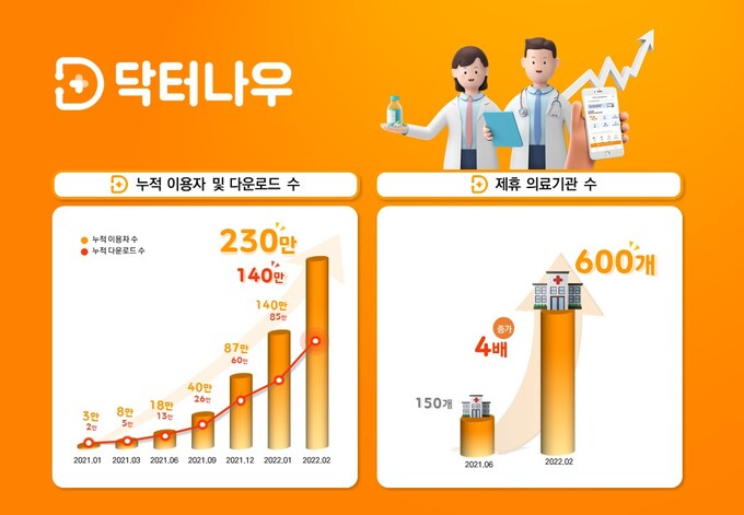 닥터나우는 전국 600여 개의 의료기관이 입점 중으로 업계에서 가장 많은 의료진과 제휴하고 있다. 이 중 병의원의 전문의 비중은 50%에 달하며 비대면 진료가 대중화되면서 작년 2월과 비교해 진료건수가 약 108배 증가했다.