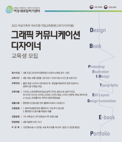[세계비즈=박혜선 기자] 중부여성새로일하기센터가 출판·그래픽디자인 분야 취·창업 지원을 위한 그래픽 커뮤니케이션 디자이너 교육생 모집을 시작한다고 17일 밝혔다.