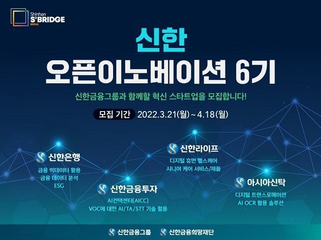 6기에 참여하는 수요기업은 신한금융 그룹사 ▲신한은행 ▲신한금융투자 ▲신한라이프 ▲아시아신탁 총 4개사이며 ▲데이터사이언스유닛 ▲자금세탁방지부 ▲ESG전략실 ▲서버개발챕터 ▲헬스케어사업팀 ▲디지털혁신팀 총 6개 부서에서 각 6개 스타트업을 선발한다. 모집 기술 분야는 빅데이터, AI 머신러닝, ESG, 헬스케어, AI OCR, 디지털 트랜스포메이션 등으로 혁신 기술 분야에 열려있다.