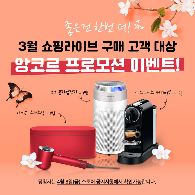 에코페어 관계자는 “3월 한 달 동안 라이브 방송 중 네퓨어 마스크를 구매하는 고객들을 위한 앙코르 이벤트도 진행한다”며 “추첨을 통해 다이슨 슈퍼소닉 1명, 쿠쿠 공기청정기 1명, 네스프레소 커피머신 1명을 증정하는 앙코르 이벤트는 제품 구매 후 스토어 리뷰를 남기면 당첨 확률이 더욱 올라간다”고 말했다.