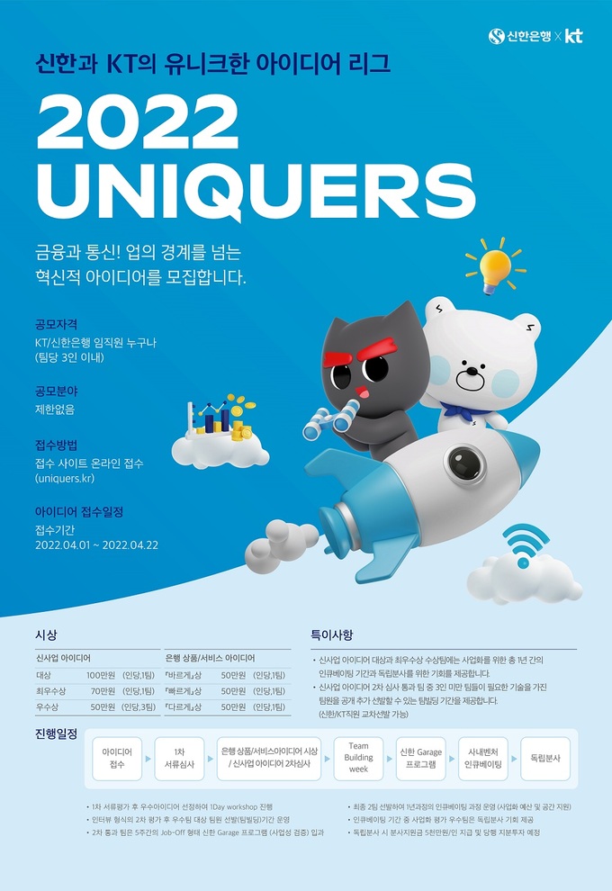 [세계비즈=오현승 기자] 신한은행은 지난 1월 KT와 전략적 파트너십 체결 이후 두 번째 공동프로젝트인 ‘2022 UNIQUERS(유니커즈)’를 추진한다고 4일 밝혔다. 유니커즈는 ‘유니크한 아이디어를 가진 유니크한 사람들’이란 뜻의 신한은행 사내 벤처 프로그램이다.