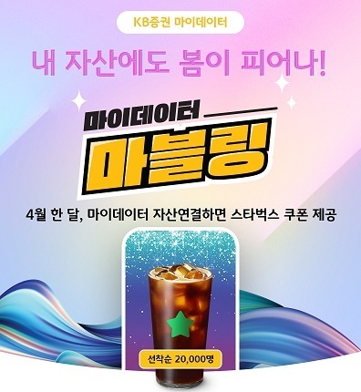 [세계비즈=주형연 기자] KB증권은 4월 한 달 동안 KB증권 마이데이터 서비스 ‘마블링’에 자산을 연결하면 스타벅스 쿠폰을 제공하는 ‘내 자산에도 봄이 피어나’ 이벤트를 진행한다고 5일 밝혔다.