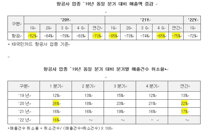 KB국민카드 관계자는 “코로나19로 항공사 매출액이 급감했지만, 서서히 매출액 감소 폭이 줄어들고 있다”며 “절대적인 매출액 감소에도 불구하고 취소율의 감소는 엔데믹의 기대를 반영한 것으로 코로나19의 빠른 종식으로 항공사를 비롯한 여행업종 매출액도 빠르게 회복되기를 기대한다”고 말했다.