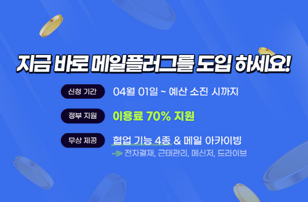이에 메일플러그는 비대면 서비스 바우처 구성으로 무제한 용량의 기업메일 20계정, 50계정, 100계정을 준비했으며 결제 주기는 12개월이다. 또한 스마트한 협업을 도와줄 협업 도구 4종 근태관리, 전자결재, 드라이브, 메신저와 실시간 데이터 복구 및 백업 등이 가능한 메일 아카이빙을 무료 혜택으로 제공한다고 업체 측은 전했다.