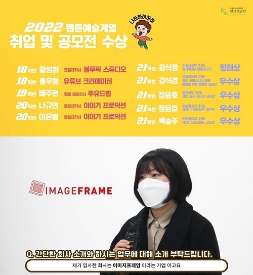 먼저 17학번 김도현, 21학번 이은별 학생은 웹툰 제작사 <이야기 프로덕션>과 콘티 작가 계약을 체결하며 앞으로 웹툰 원고 제작을 위한 스토리 및 작화, 연출 등 다양한 분야에서 활약할 예정이다.