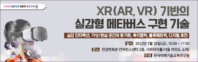 [세계비즈=권영준 기자] 한국미래기술교육연구원은 오는 5월20일 서울 여의도 전경련회관 사파이어홀에서 'XR(AR, VR) 기반의 실감형 메타버스 구현 기술 - 실감 인터랙션, 가상/현실 공간의 동기화, 촉각햅틱, 볼류메트릭, 디지털 휴먼' 세미나를 온, 오프라인으로 병행해서 개최한다고 밝혔다.
