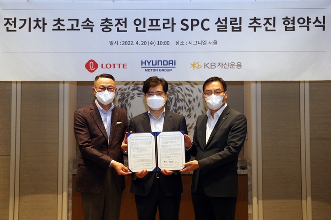 롯데그룹은 20일 서울 잠실 시그니엘 서울에서 현대자동차그룹, KB자산운용과 ‘전기차 초고속 충전 인프라 SPC(특수목적법인, 가칭 UFC)’ 설립 추진을 위한 협약을 체결했다고 밝혔다. 이날 협약식에는 롯데지주 이동우 대표이사, 현대차그룹 공영운 사장, KB자산운용 이현승 대표이사 등이 참석했다.