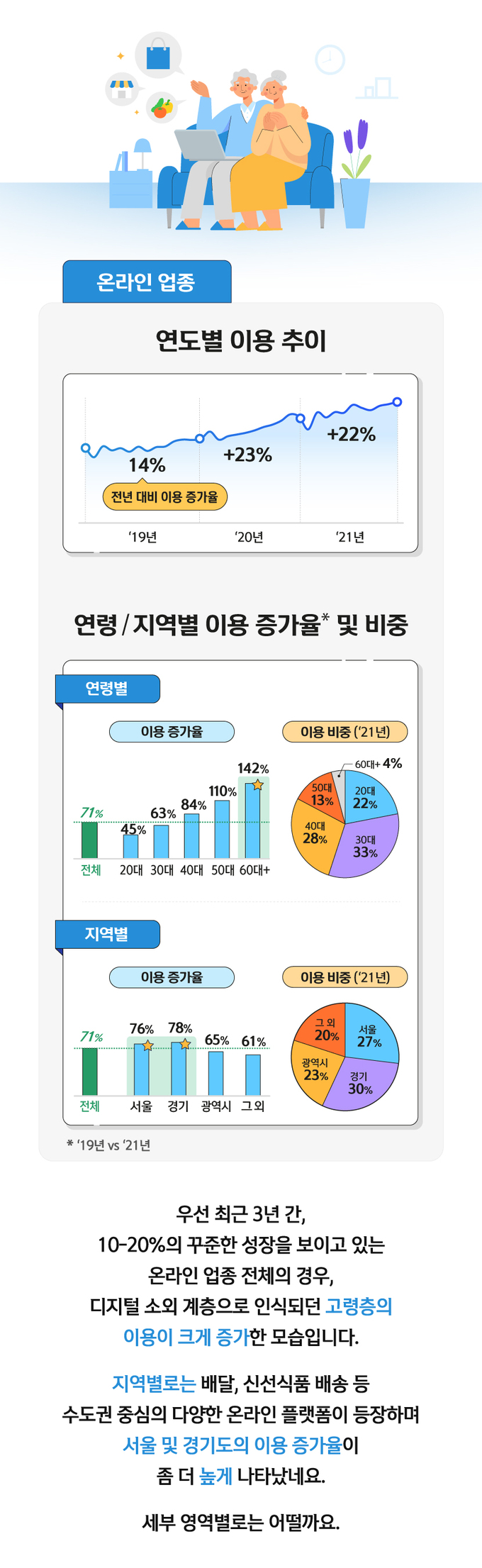 먼저 온라인 업종 전체의 연도별 이용 추이를 살펴보면 2019년부터 2021년까지 전년 대비 이용 증가율은 각각 14%, 23%, 22%로 나타나 꾸준한 성장을 보이고 있다. 온라인 업종의 2019년 대비 2021년 연령별 이용 증가율의 경우 20대는 45%, 30대 63%, 40대 84%, 50대 110%, 60대 이상 142%를 기록했다. 이에 따라 디지털 소외 계층으로 인식되던 40대 이상 연령층의 이용이 크게 증가한 것으로 보인다. 같은 기간 지역별 이용 증가율의 경우 서울 76%, 경기 78%, 광역시 65%, 이 외 지역 61%로 수도권의 이용 증가율이 다소 높게 나타났다.