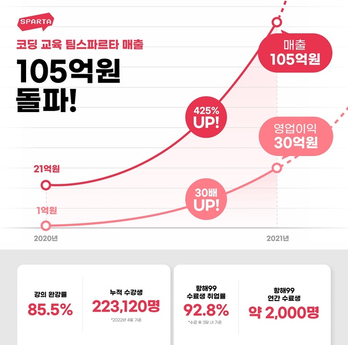 [세계비즈=권영준 기자] 코딩 교육 스타트업 팀스파르타가 2021년 매출 105억원, 영업이익 30억원을 기록했다. 이는 전년 동기 대비 매출 425%, 영업이익 30배가 증가한 수치로 가파른 J커브를 그려 나가고 있다.