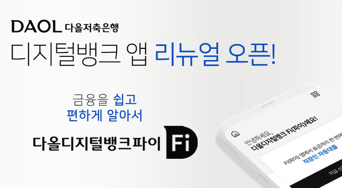 25일 저축은행업계에 따르면 다올저축은행은 최근 ‘디지털뱅크 Fi(파이)’ 앱을 리뉴얼 오픈했다. Fi(Financial Intelligence)는 다올저축은행의 디지털뱅크 브랜드로, 유진저축은행에서 다올저축은행으로 사명을 변경하면서 새로 나온 서비스다. Fi는 예·적금 및 대출계좌 등 자산 현황을 한눈에 확인할 수 있고 24시간 자동대출 서비스가 가능하다.