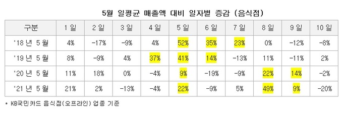 KB국민카드는 최근 4년간 신용카드·체크카드의 5월 매출 빅데이터를 통해 거리두기가 해제된 가정의 달의 음식업종과 놀이동산 업종의 세부 업종·일자·연령별 매출액을 분석했다고 27일 밝혔다.