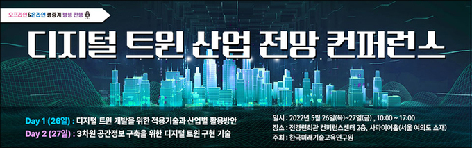 [세계비즈=권영준 기자] 한국미래기술교육연구원은 오는 5월26일 부터 이틀간 서울 여의도 전경련회관 사파이어홀에서 '디지털 트윈 산업 전망 컨퍼런스 - 적용기술과 산업별 활용방안 및 3차원 공간정보 구축 기술'를 온, 오프라인으로 병행해서 개최한다고 27일 밝혔다.