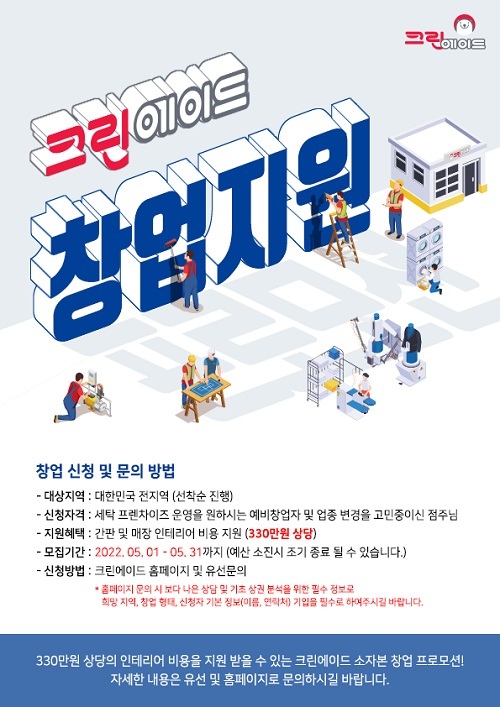 [세계비즈=박보라 기자] 세탁편의점 프랜차이즈 크린에이드가 4월 진행했던 창업 지원 프로모션의 기한을 5월로 늘려 추가 진행한다고 2일 밝혔다.