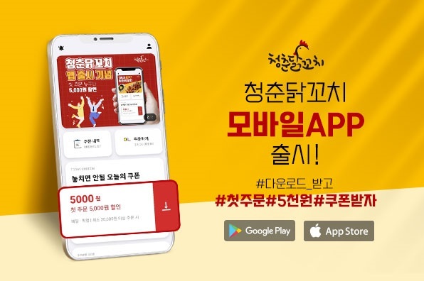 한편 청춘닭꼬치 배달 전용 앱은 구글 플레이스토어, 애플 앱스토어 등에서 무료로 다운로드할 수 있다.