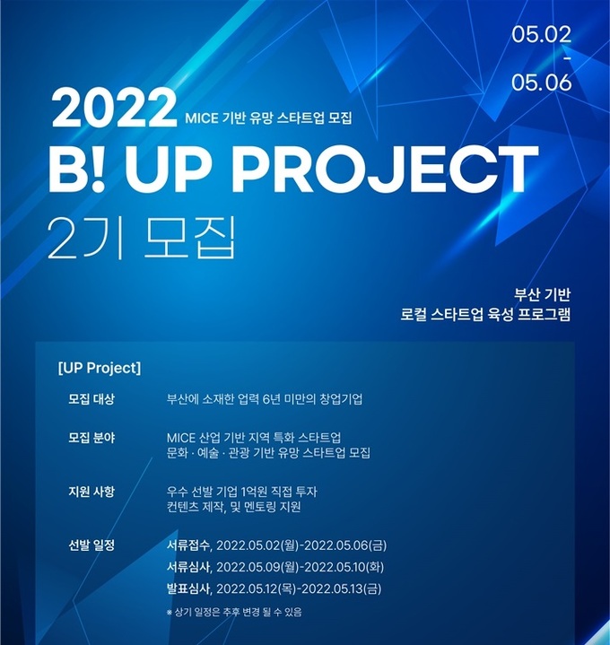 [세계비즈=황지혜 기자] 비아이벤처스(BIventures)가 오는 6일까지 ‘UP PROJECT’ 2기를 통해 부산에 소재한 MICE 기반 지역특화 산업 및 문화, 예술 분야에서의 유망 스타트업을 모집한다고 2일 밝혔다.