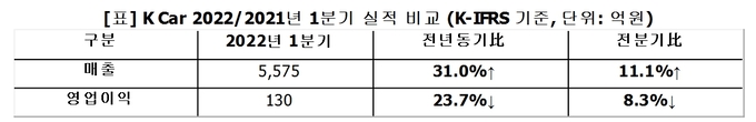 9일 케이카에 따르면 2022년 1분기 잠정 경영실적(K-IFRS 연결재무제표 기준)을 집계한 결과 매출 5575억원을 기록했다. 케이카 관계자는 “유가 상승, 금리 인상, 오미크론 확산 등 대외적 이슈로 시장 침체기에도 전년 동기 대비 31% 증가했다”고 설명했다.
