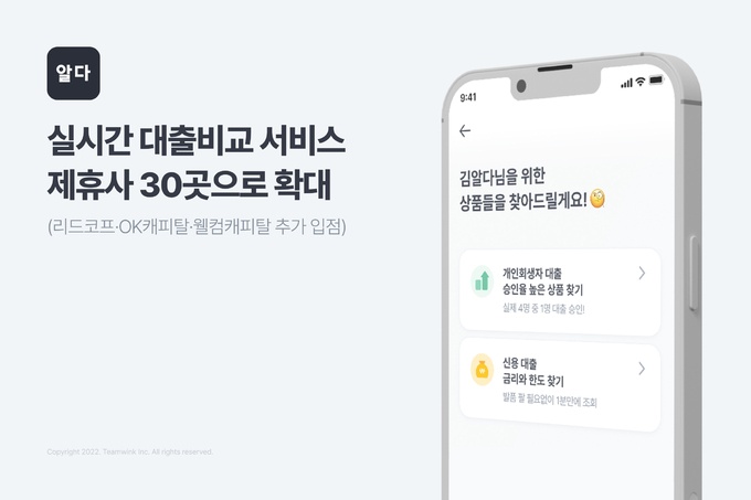 [세계비즈=오현승 기자] 팀윙크는 11일 리드코프·OK캐피탈·웰컴캐피탈이 자사 대출비교 플랫폼 알다에 입점했다고 밝혔다. 이로써 팀윙크는 알다 제휴 금융사 수를 30곳으로 확대했다.