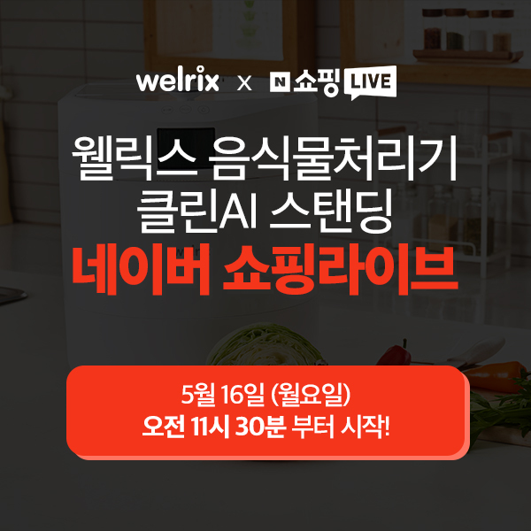 [세계비즈=박보라 기자] 웰릭스가 음식물처리기에 AI 기능을 담은 신제품을 선보이며 네이버 쇼핑라이브를 진행한다고 16일 밝혔다.