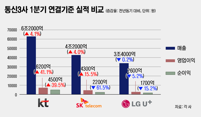 15일 업계에 따르면 KT는 올해 1분기 연결기준 매출, 영업이익, 순이익 모두 성장을 기록하며 쾌조의 스타트를 끊었다. 매출은 6조2777억원으로 지난해 같은 기간 대비 4.1% 증가했으며, 영업이익은 무려 41.1% 증가한 6266억원을 달성했다. 순이익 역시 4554억원으로 39.5% 증가했다.