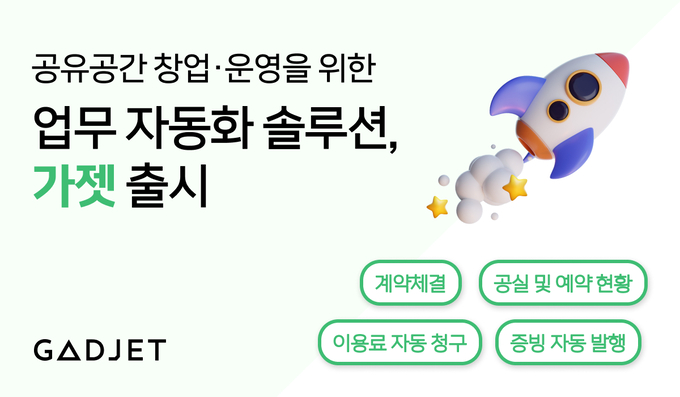가젯은 공유 공간 운영 자동화 솔루션으로 2022년 5월 현재 전국 90여 개의 공유 공간에서 가젯을 이용하고 있다. 공간 예약, 계약서 작성, 이용료 결제 및 정산 등 공간 운영을 위한 필수 기능으로 공간 운영자의 관리 복잡성을 단순화해 효율성을 극대화할 수 있도록 돕는다.