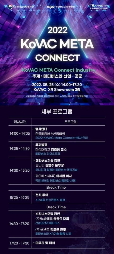 [세계비즈=권영준 기자] 과학기술정보통신부와 정보통신산업진흥원이 주최하고, 한국메타버스산업협회가 주관하는 ‘2022 KoVAC META Connect 인더스트리’가 25일(수) 오후 2시 상암동 한국가상증강현실콤플렉스(KoVAC)에서 온·오프라인으로 개최된다.