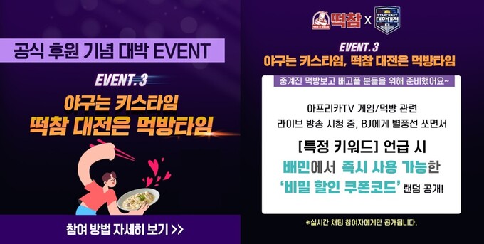 스타대전 공식 후원사 떡참(떡볶이 참 잘하는집)은 오는 6월 8일 이전까지 아프리카TV에서 스타대전 경기 진행 시간 외에 게임/먹방 관련 라이브 방송 시청 중, BJ에게 별풍선을 쏘면서 ‘특정 키워드’를 언급할 경우 배달 앱 배민(배달의민족)에서 즉시 사용 가능한 비밀 할인 쿠폰코드를 랜덤 공개한다고 밝혔다.
