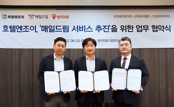 [세계비즈=박혜선 기자] 마이앨리(대표 김우식)가 지난 2일 코로나19 펜데믹 기간 어려움을 겪은 소상공인을 지원하기 위해 메이트아이, 생각대로와 손잡고 호텔엔조이 가맹점에 ‘매일드림 선정산 서비스’를 지원하기 위한 MOU를 체결했다고 3일 밝혔다.