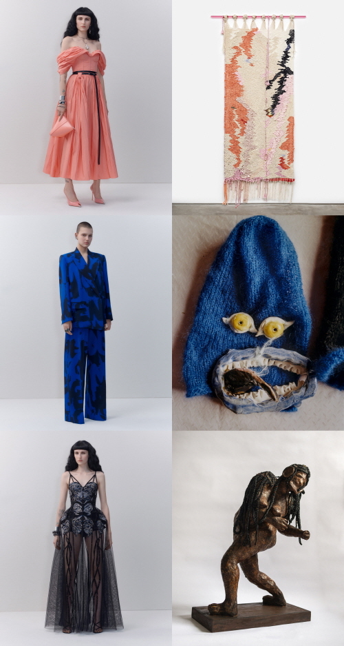 또한 노르웨이의 아티스트이자 조각가인 ‘Ann Cathrin November Høibo’는 보우 드레이프와 드레이프 소매가 특징인 크러시드 애프리콧 색상 폴리파유 소재 드레스에서 영감 받아 온화함과 여성스러움을 간직한 태피스트리 작품으로 맥퀸만의 따뜻한 분위기를 전했다. 청량한 일렉트릭 블루 색상의 수트를 선택한 런던의 아티스트 ‘Judas Companion’는 블루 컬러의 실과 세라믹, 자수장식, 콘크리트로 재치 있게 결합시킨 그녀의 영감을 실제 착용 가능한 모자로 탄생시켜 예술과 패션의 결합을 추구했다고 브랜드 측은 전했다.