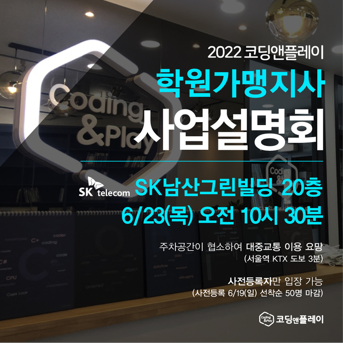 [세계비즈=박보라 기자] ㈜코딩앤플레이(대표 이정석, 류경희)가 오는 23일 SK텔레콤 남산 사옥에서 AI코딩교육 학원 프랜차이즈 지사 가맹 사업 설명회를 개최한다고 15일 밝혔다.