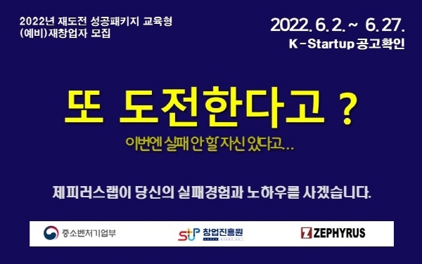 [세계비즈=황지혜 기자] 기업가치 제고 전문기업 제피러스랩에서 전국 예비재창업자를 대상으로 참여기업 육성지원, 투자유치, 성공역량 강화를 위한 ‘2022년 재도전성공패키지 교육형’ 프로그램에 참여할 예비재창업자를 오는 27일까지 모집한다고 14일 밝혔다.