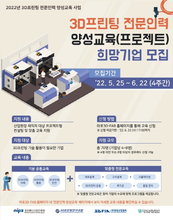 [세계비즈=황지혜 기자] 3D프린팅연구조합, 3D융합산업협회, 링크솔루션 컨소시엄은 과학기술정보통신부와 정보통신산업진흥원(NIPA)이 공고한 ‘2022년 3D프린팅 전문인력 양성 교육 사업(프로젝트)’(이하 ‘교육사업2’)의 수행기관으로 선정돼 교육사업의 참가 기업을 모집한다고 14일 밝혔다.