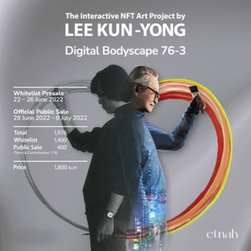 업체에 따르면 시작은 실험미술의 거장 이건용(1942년생)과 함께한다. 이건용(1942년)작가의 디지털아트 NFT ‘디지털 바디스케이프 76-3’ 작품 1976개를 발매 예정이며 이건용 작가는 1960년대 후반부터 자신의 신체와 작품이 전시되는 장소, 관람객이 만들어내는 관계성에 주목하는 다양한 퍼포먼스와 설치, 회화 작업으로 높은 평가를 받는 작가이다.