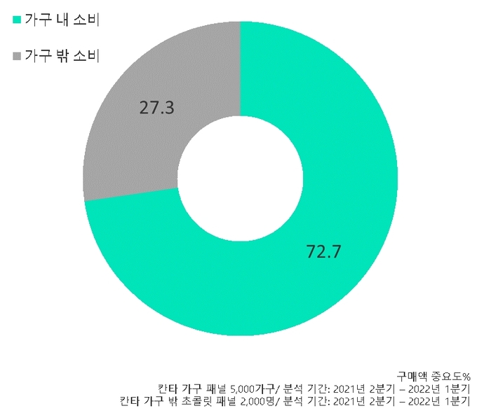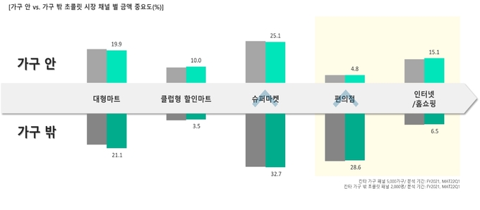 반면에 가구 안 시장에서는 편의점을 통한 소비가 크지 않았다. 대신 온라인이 큰 비중을 차지하면서 소비자들의 구매 채널 또한 취식 상황에 따라 다른 모습을 보였다.