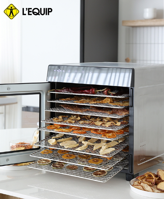 8엽 날개가 만드는 후면 열풍은 식재료를 건조 중간에 뒤집지 않아도 8단 트레이 모두 고르게 건조시켜주며, 내열유리로 제작된 전면 투명 도어와 내부 조명을 이용해 건조 중간에도 열 손실이나 화상 걱정 없이 건조 상태를 수시로 확인할 수 있다.