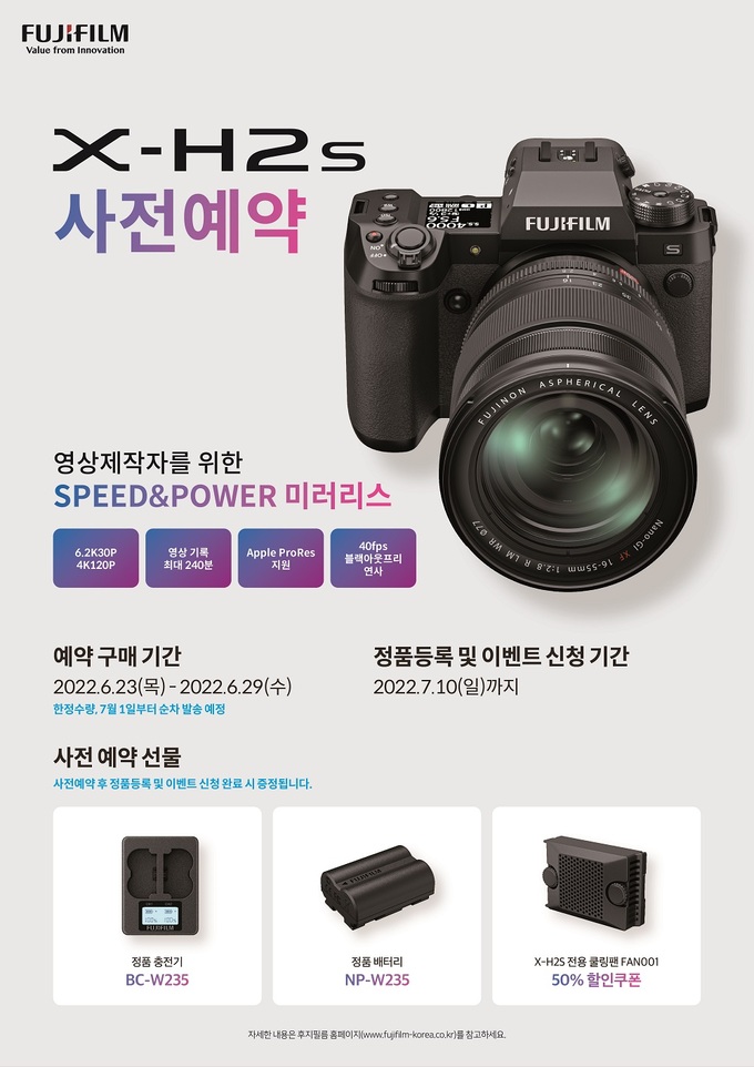 [세계비즈=권영준 기자] 후지필름일렉트로닉이미징코리아(이하 후지필름 코리아)가 동영상 촬영에 특화된 5세대 X시리즈 미러리스 카메라 ‘X-H2S’의 사전 예약 판매를 시작한다.