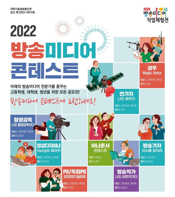 콘테스트는 예선·사전교육·결선으로 구성되는 경연 형식 4개 부문과 별도 예선 과정이 없이 제출된 콘텐츠로 평가하는 공모전 형식 4개 부문으로 개최되며, ‘방송미디어 직업체험전’ 홈페이지를 통해 신청받는다.