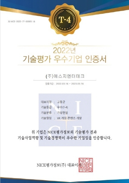 글로벌 VR게임 플랫폼 서비스를 목표로 2019년에 설립된 SG엔터테크는 KT Super VR Game ‘도전관’에서 대상을 수상한 바 있으며 올해 초 기술신용보증에서 의뢰, NICE평가정보㈜에서 진행한 기술평가우수기업(TCB) 인증에서 상위 기술 기업등급인 ‘T-4등급’을 획득한 바 있다.