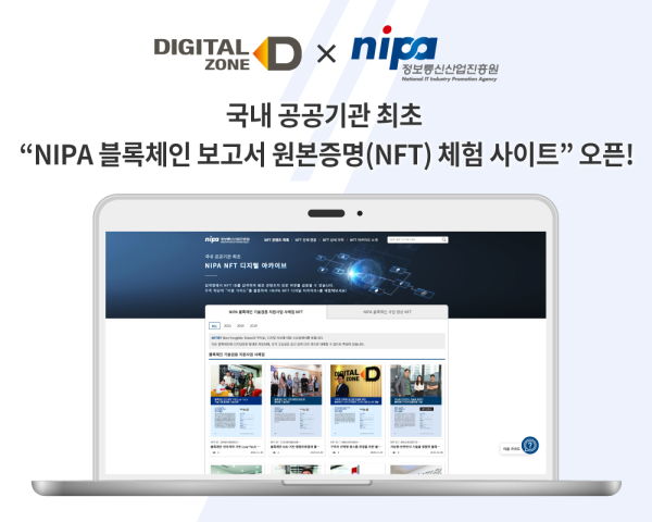 [세계비즈=황지혜 기자] 블록체인 전문 기업 ㈜디지털존(대표이사 전정우)이 국내 블록체인 및 NFT 기술을 공공부문에 적용한 웹 사이트 'NIPA 블록체인 보고서 원본증명(NFT) 체험 사이트'를 지난 6월 20일 오픈했다고 1일 밝혔다.