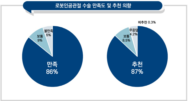 설문 응답자의 86%는 로봇인공관절 수술 후 수술 결과에 대해 만족한다고 답변했으며, 87% 응답자는 지인에게 로봇인공관절 수술을 추천할 의향을 보였다.