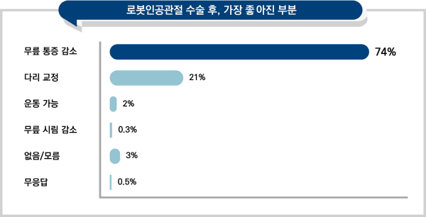 로봇 인공관절 수술 후 가장 좋아진 점으로도 75%가 ‘무릎 통증의 감소’를 21%가 ‘다리 교정’를 꼽았다. 특히 수술 전 통증 감소 효과에 대한 기대감이 높았던 만큼 무릎 통증 감소에 대한 만족도도 높았다.