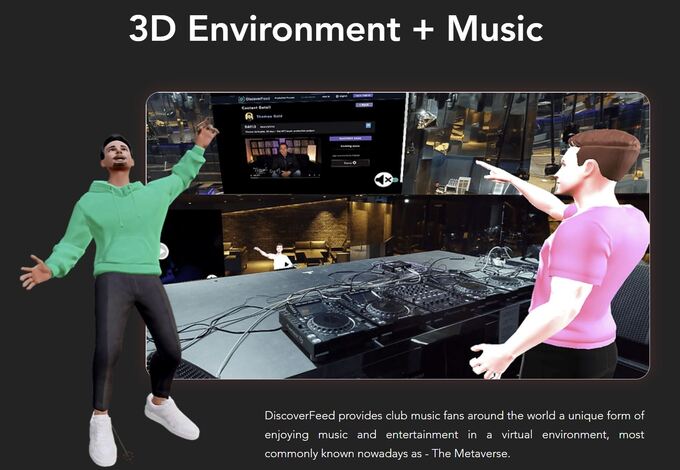 디스커버피드는 일본에 소재한 개발 기업으로 세계 각국의 유명 클럽들을 새로운 컨셉의 3D 메타버스 공간으로 구현하고 이를 다양한 디지털 콘텐츠와 연동시키는 사업을 추진하고 있다. 디스커버피드는 이미 일본의 초대형 클럽인 SEL OCTAGON TOKYO와의 파트너십을 통해 전세계 유명 DJ 들의 공연을 일본 클럽 방문자들에게 선보이는 등 디지털 기술을 활용한 다양한 콘텐츠 융합 사업을 전개하며 업계 관계자들에게 큰 관심을 받고 있다.