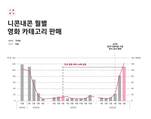 뿐만 아니라 관람권 가격 인상으로 인해 매출액은 오히려 코로나19 이전 최고 매출을 기록한 2019년 12월 대비 17.7% 상승한 모습을 보였다. 현재 니콘내콘에 입점된 영화 관람권은 최대 34%까지 저렴하게 구매 가능한 만큼, 향후 관련 카테고리 매출은 더욱 증가할 것으로 보인다.