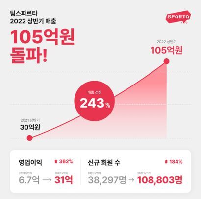 13일 코딩 교육 스타트업 팀스파르타에 따르면 올해 상반기 매출 105억원, 영업이익 31억원을 달성했다고 밝혔다. 이는 2021년 연간 매출 및 영업이익과 비슷한 수준으로, 전년 동기 대비 매출은 243%, 영업이익은 362.7% 증가한 것으로 나타났다. 또, 전년 동기 대비 신규 회원수도 3만 8297명에서 10만 8803명으로 184% 늘어났다.
