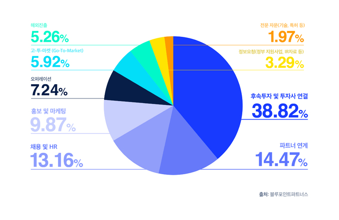 15일 테크 엣지 액셀러레이터 블루포인트파트너스(이하 블루포인트)에 따르면 그동안 블루포인트의 포트폴리오사들로부터 지원 요청을 받았던 사항들을 분석해 그 결과를 발표했다. 그 결과 블루포인트의 포트폴리오사들은 스타트업을 운영하며 가장 필요로 한 지원서비스로 ‘후속투자유치(38.82%)’를 꼽았다.