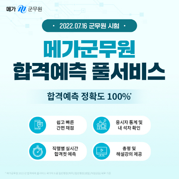 [세계비즈=박보라 기자] 메가군무원이 2022 9급 및 7급 군무원 시험이 시행되는 16일 군무원 공채 필기시험 수험생들을 위해 ‘합격예측 풀서비스’를 제공한다고 밝혔다.